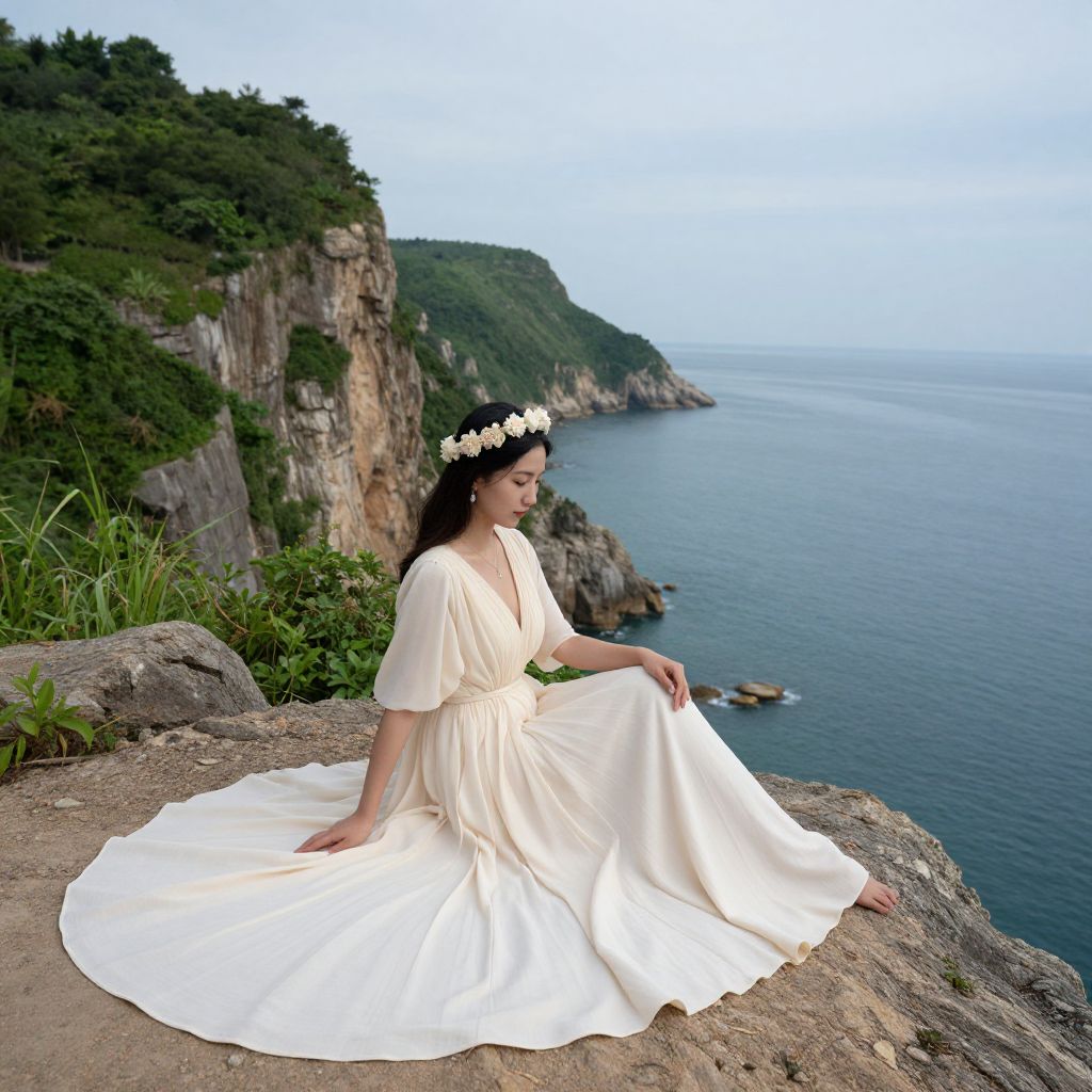 Woman seated gracefully on a rocky cliffside overlooking a serene coastal landscape, wearing a flowing cream gown adorned with a floral headpiece, her gaze directed downward amidst a backdrop of lush greenery, rugged cliffs, and expansive blue waters.