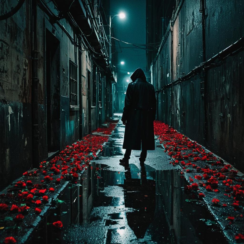 A dark, moody urban alleyway at night with wet reflective ground and scattered red flowers growing along the edges. The alley features old, rusty metal structures and cracked walls, illuminated by cinematic street lighting. A solitary figure wearing a black hooded coat stands in the distance, creating a dramatic scene with low key lighting emphasizing dark teal and red color contrasts.