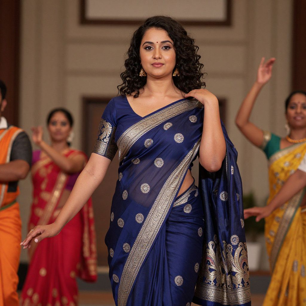 Photograph of a curvy Indian woman with medium skin tone and curly black hair, wearing a navy blue saree with silver embroidery, confidently walking a