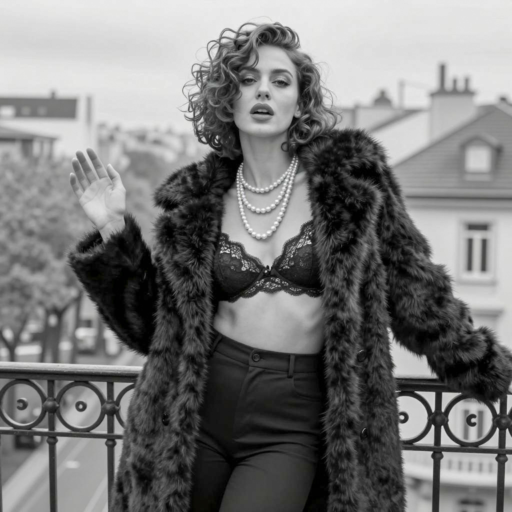 Black-and-white photograph of a slender woman with dark, wavy hair in an updo, wearing a strapless sequined dress, large ornate necklace, multiple bracelets, and earrings. She stands against a ured wall, hand on head, looking sideways. Her expression is intense. She wears dark lipstick and holds her skirt slightly up. The background includes a vertical pipe and a wooden door.
