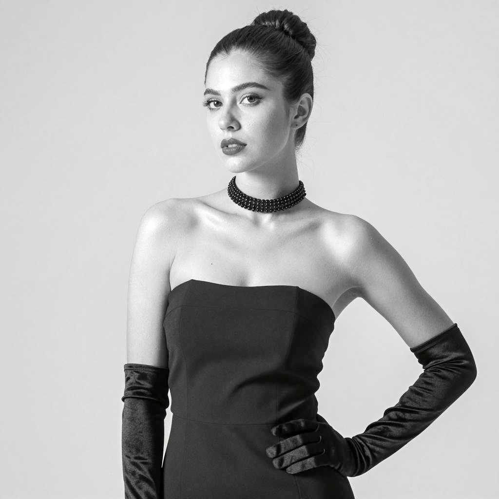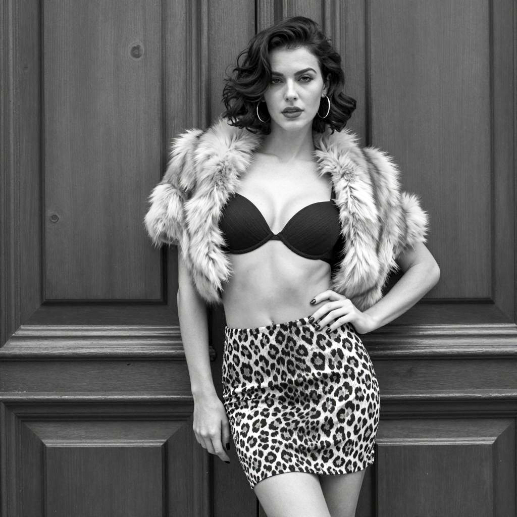 Black-and-white photo of a slender woman with dark wavy hair styled in an updo. She is wearing a strapless sequined dress, large ornate necklace, multiple bracelets, and earrings. The woman poses against a textured wall beside a vertical pipe and a wooden door, with one hand on her head and an intense sideways gaze. She has dark lipstick and subtly lifts her dress skirt.