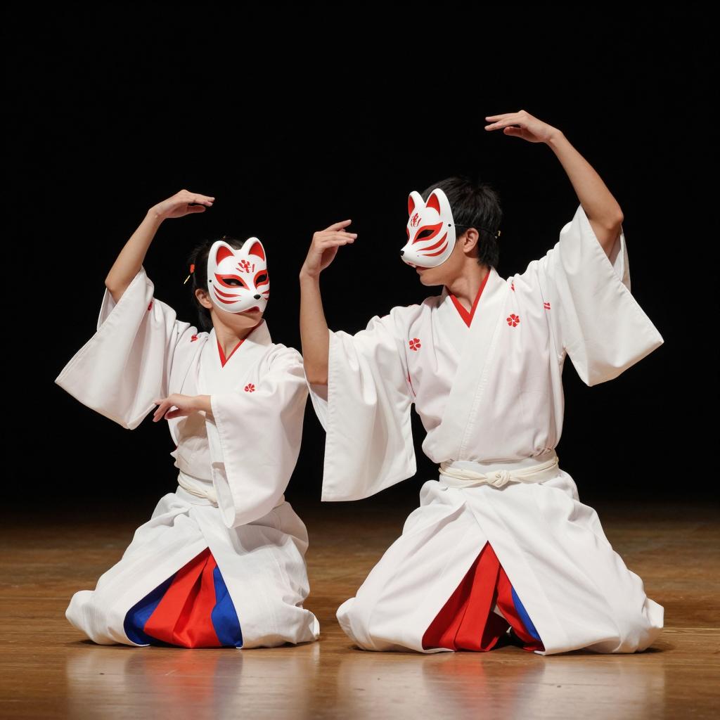 Two people in white and red traditional Japanese costumes with fox masks, kneeling and performing a dance. White robes with red and blue patterns, white fur masks with red and blue designs. Both have long sleeves and wide hems. The person on the right has black hair, the person on the left has short hair. Dark background, wooden floor.