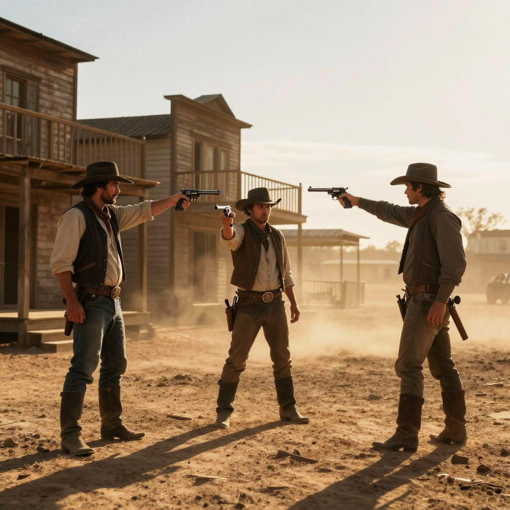 Three way standoff in a dusty old western town at sunset, tense cowboys with pistols drawn, dramatic shadows cast on wooden buildings, gritty atmosphere, intense eyes locked in a triangular confrontation, cinematic wide angle view, vintage color palette.