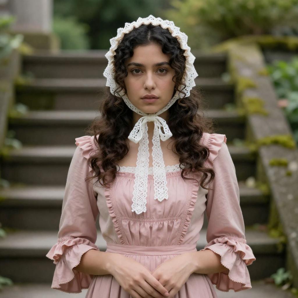 Woman with long dark curly hair, white ruffled shirt, brown vest, and brown skirt holding a brown blanket, stands in a lush garden. Wooden fence background, greenery, flowers, and a wicker basket on the right. Bright sunlight.