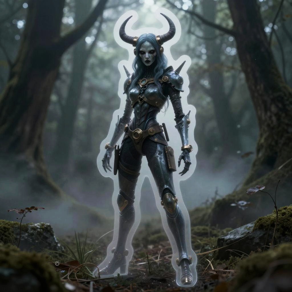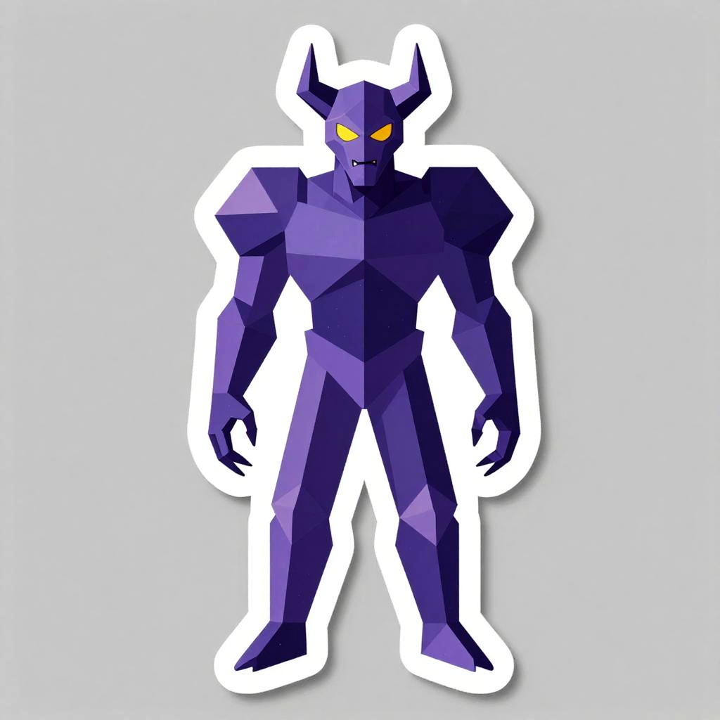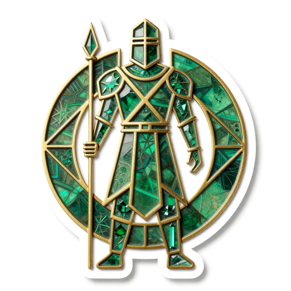 Mechashot Warden in sticker etched brass geometric art style emerald green and copper