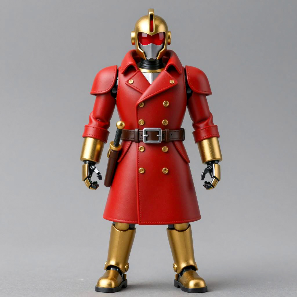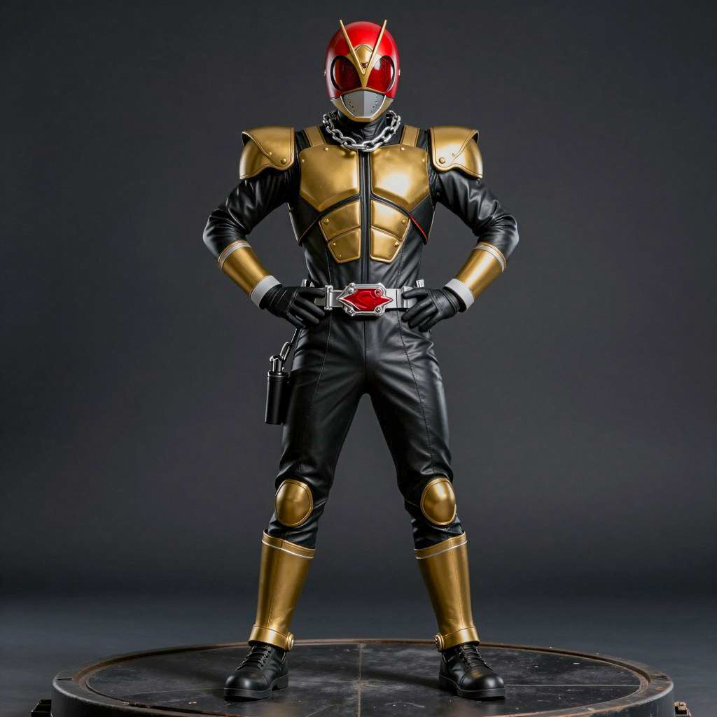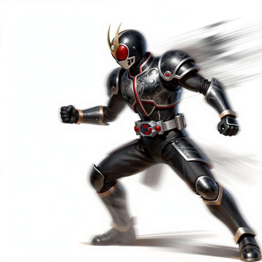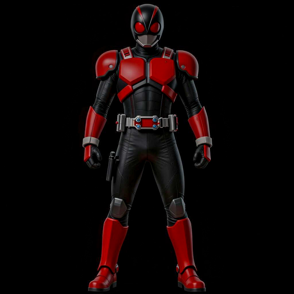 Digital illustration of a superhero in a black and red armored suit. He stands with arms slightly apart, legs shoulder-width. The suit has red accents on chest, shoulders, and knees. Red and black armor plating covers his hands and feet. He wears a helmet with red eye slits. His face is not visible. The background is solid black. The suit has a silver belt with a red center. His fingers are relaxed.