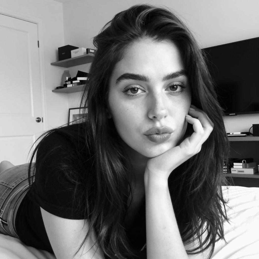 A woman with fair skin, dark hair in a messy updo, and dark eyes. She is smiling with slightly parted lips, wearing a white off-shoulder top. Background is dimly lit, gray wall. She has minimal makeup, visible freckles. Head slightly tilted to the left, hair partially covering her right ear.