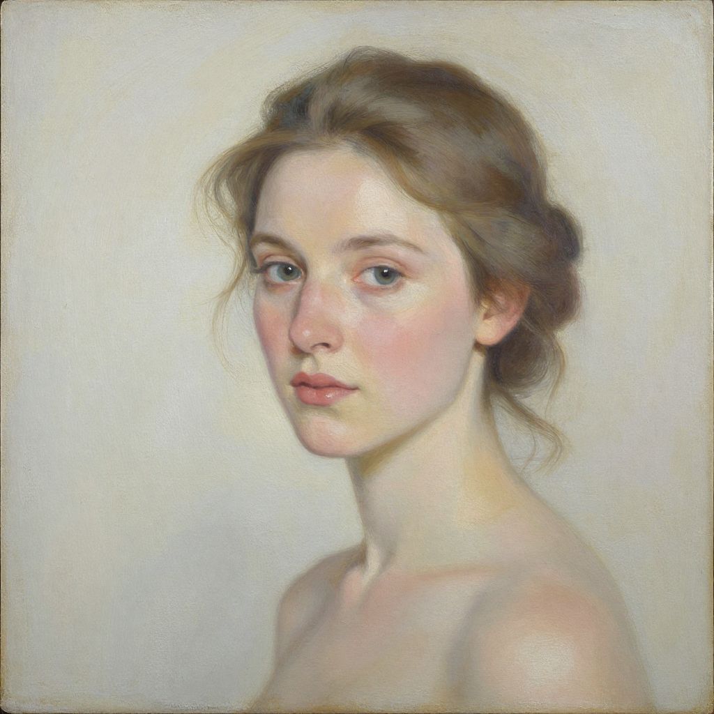 This is a realistic digital painting of a young Caucasian woman with fair skin and light brown hair loosely tied back, revealing soft, delicate features. She has blue eyes, slightly pink lips, and a gentle expression. The background is a simple, pale beige color, making her the focal point. She is portrayed from the shoulders up, with a hint of her bare shoulders visible, suggesting she may be topless. The lighting is soft, highlighting her facial structure and creating a gentle shadow on her neck. The texture of the painting mimics traditional oil painting, with visible brushstrokes adding depth and realism to her skin and hair.
