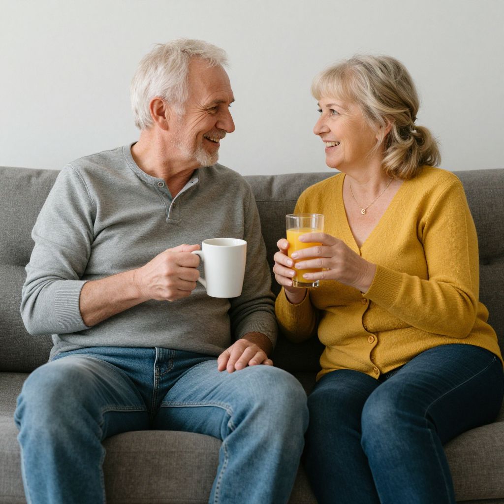 Photograph of an elderly couple sitting on a gray couch in a bright, modern living room. The man, with white hair and wearing a light gray polo shirt and beige pants, smiles at the woman. She has gray hair, wears a beige cardigan over a white blouse, and beige pants. Both hold cups; his is white, hers contains orange juice. The background features a wooden shelf with potted plants and framed pictures. Natural light floods the room, enhancing the warm, friendly atmosphere.