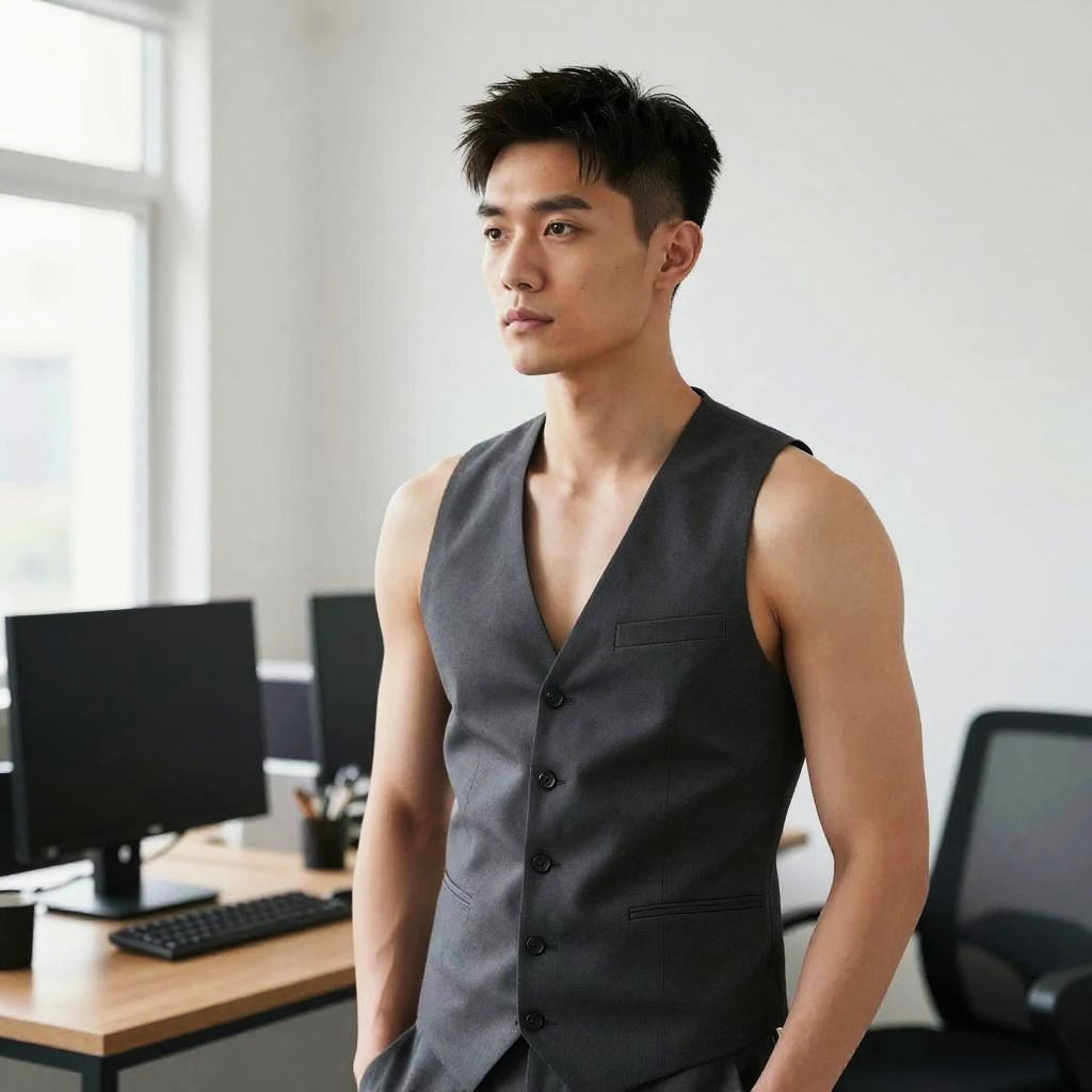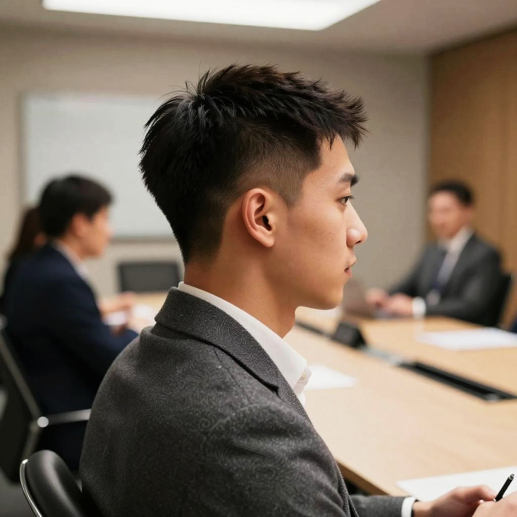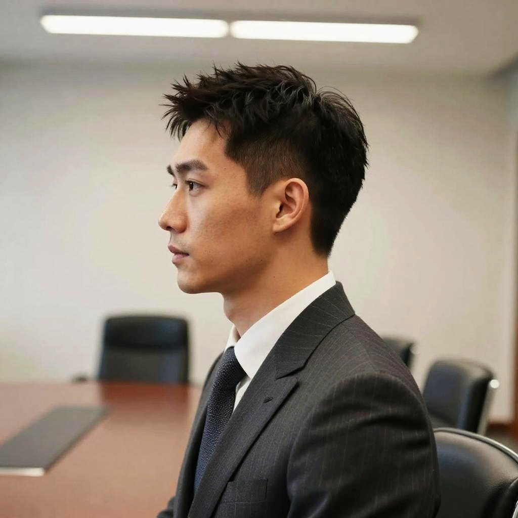 Side Part Undercut hairstyle on businessman, wearing pinstripe suit and tie, in conference room, captured in fashion editorial style with fluorescent overhead light.