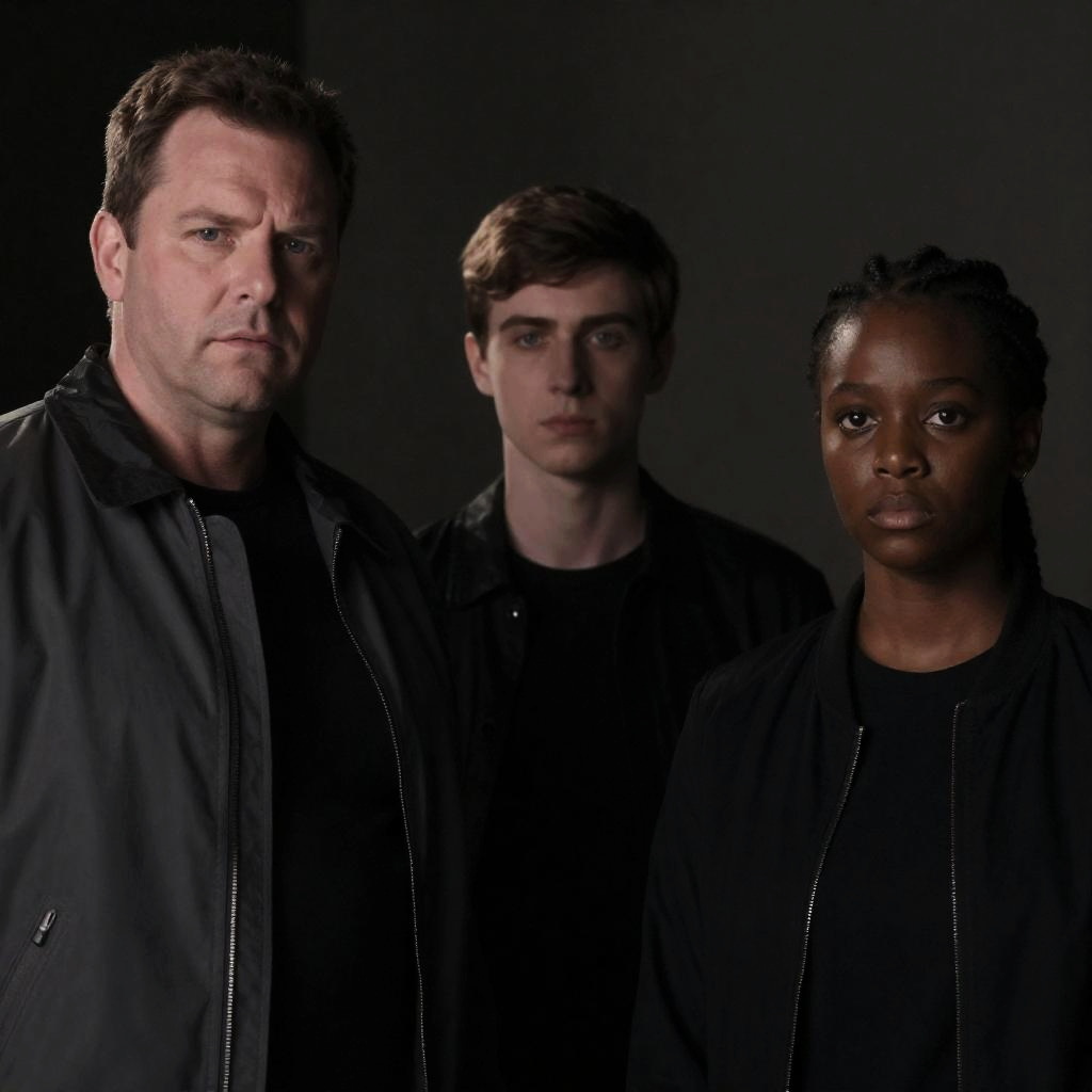 Photograph of two people in dim blue lighting. A white man with short brown hair in a dark jacket stands to the left, looking concerned. A dark-skinned woman with a high bun in a black sleeveless top stands to the right, looking intense. She wears bracelets on her right wrist. Both stand close together, slightly turned towards each other.