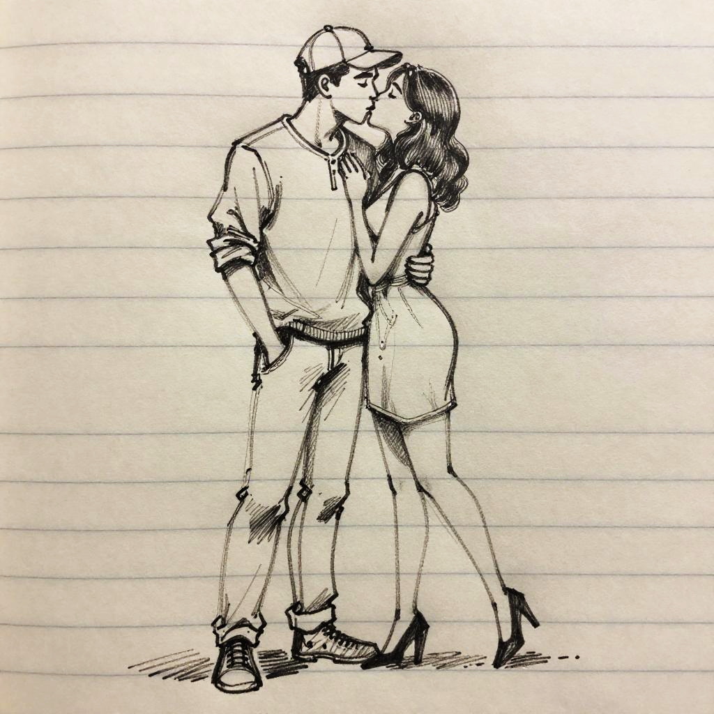This is a sketch-style drawing on lined notebook paper. It features a man and a woman standing close, about to kiss. The man, wearing a cap, shirt, and pants, has his hands in his pockets. The woman, with wavy hair, is in a short dress and high heels. Their bodies are leaning towards each other, creating an intimate moment. The sketch is done in black ink, with a simple, emotive style.