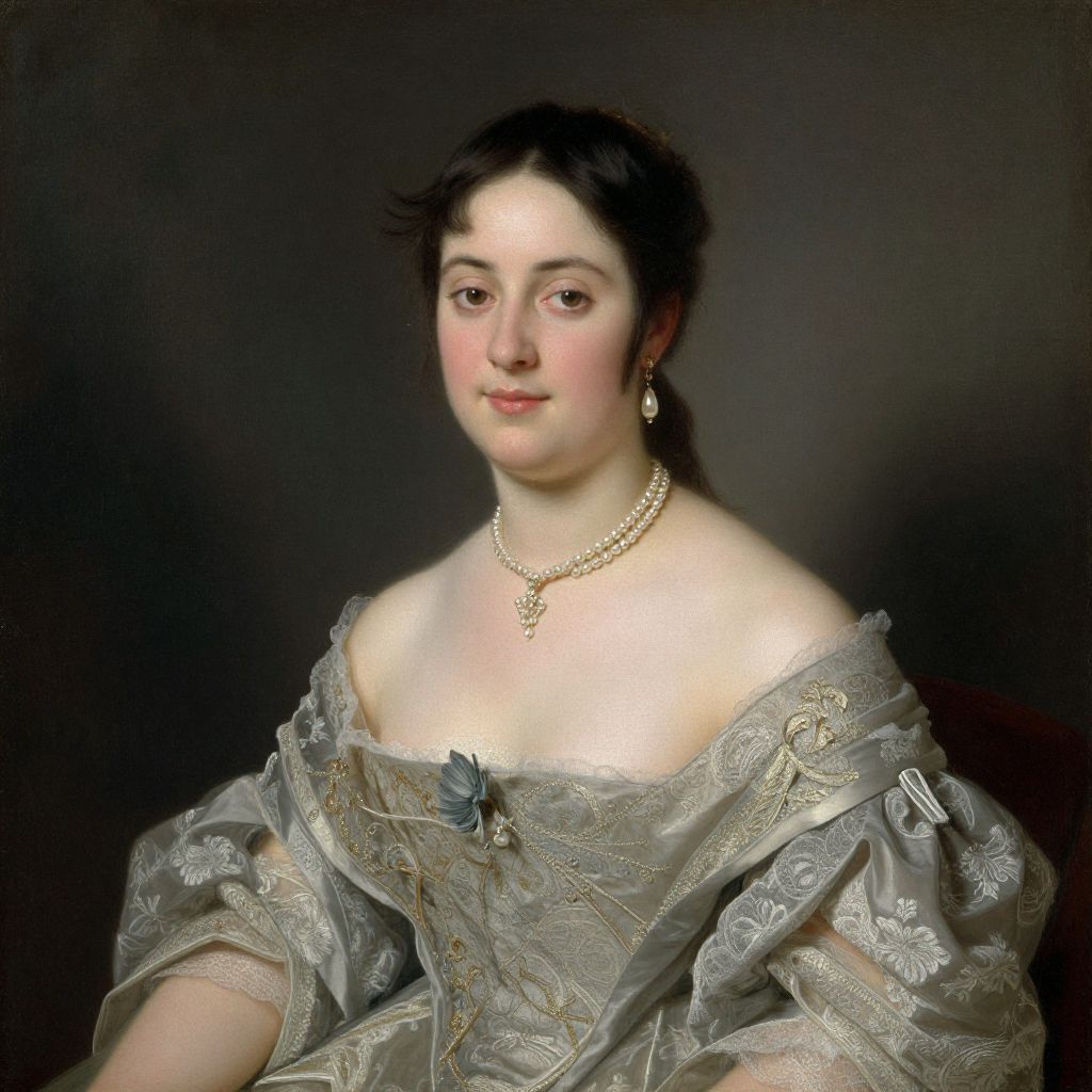 Portrait of Madame F, painted between 1850-1851, depicts a woman in an elegant off-the-shoulder gown adorned with intricate lace detailing, complemented by a delicate pearl necklace and matching earrings, set against a dark, textured background that accentuates her poised demeanor.