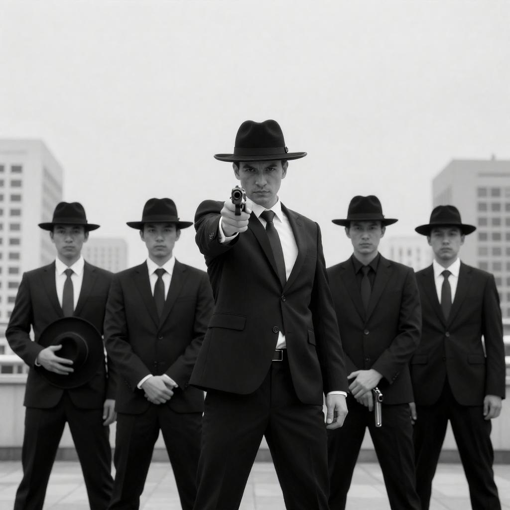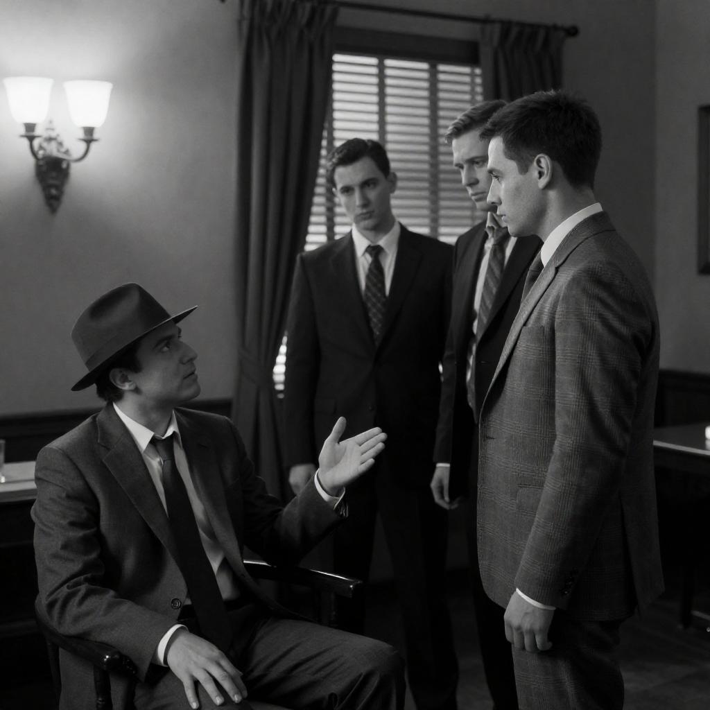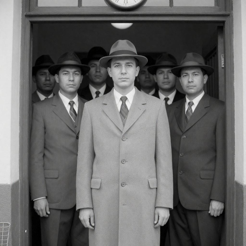 Black and white photograph of seven men in suits and hats standing in a doorway. Central man in light coat faces forward. Six men behind him have serious expressions. Doorframe on left and right. Clock above door. Metal handbasket on left.