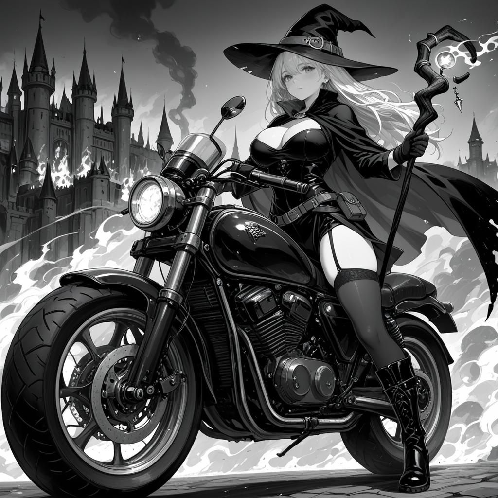 Monochrome digital artwork of a solo witch with long hair wearing a witch hat, cape, gloves, and thigh-high boots, standing beside a motorcycle. She holds a mystical staff while a large castle burns with smoke and flames in the background, creating a dramatic fantasy scene.