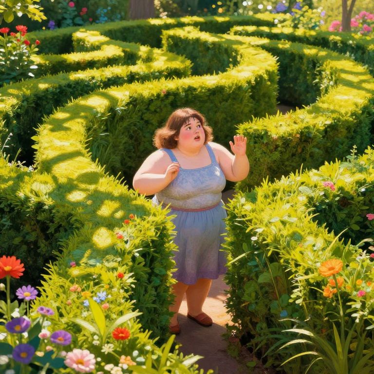 Fat girl stuck in a colorful maze made of tall hedges, vibrant flowers around, bright afternoon light casting playful shadows, her face showing curiosity and effort, whimsical and dreamy atmosphere, painterly style with rich textures