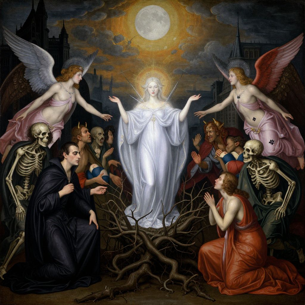 The image depicts a highly detailed and intricate scene reminiscent of Jacob Isaacsz van Swanenburg's \"Seasons in the Size of Days,\" with a demon vampire congregation. The central figure, a radiant, ethereal woman, is encircled by a nest of dark, twisted branches, symbolizing rebirth or transformation. Surrounding her are various figures, including angels with outstretched wings, and a group of skeletal figures, possibly representing the undead or the afterlife. The background features a dramatic, gothic cityscape with tall, dark buildings, adding to the ominous atmosphere. The sky is filled with clouds and a full moon, casting a somber light over the scene. The overall composition is rich with symbolic elements, textures, and colors, creating a sense of depth and complexity. The interplay of light and shadow, along with the detailed rendering of each figure and object, enhances the visual richness of the image.