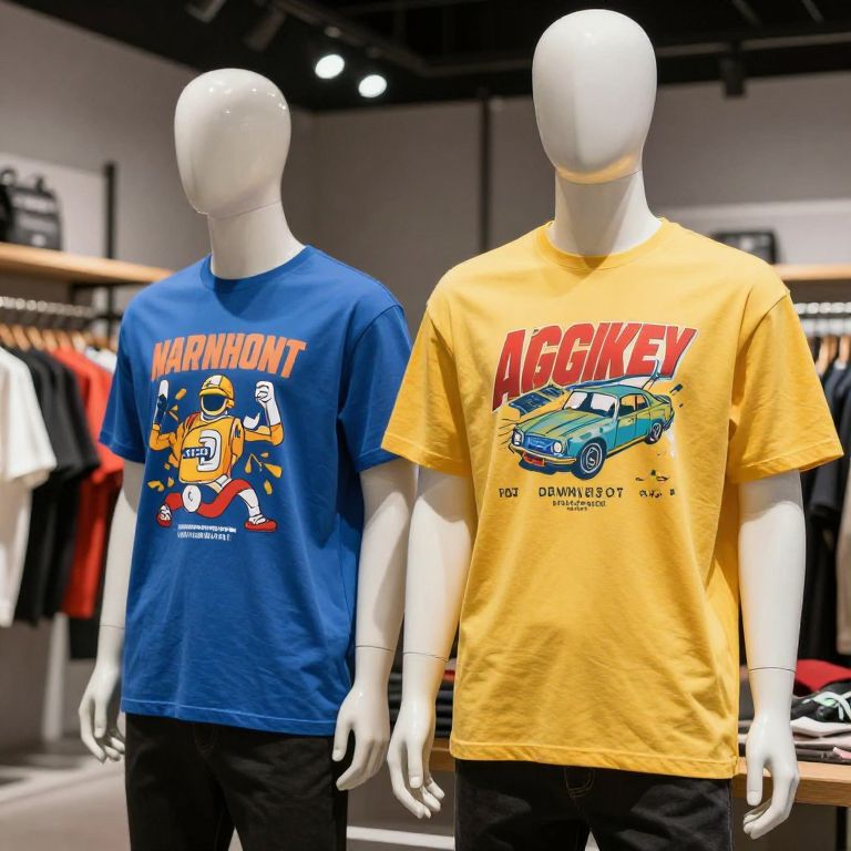 Colorful streetwear graphic tees displayed on mannequins in a modern urban boutique, detailed textures and realistic lighting, professional photography