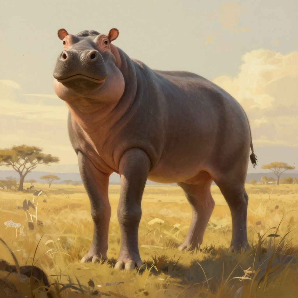 Digital painting of a skinny hippo in a magical savannah, tall slender legs, smooth textured skin, warm golden-hour lighting, artistic fantasy realism