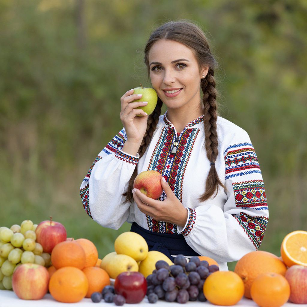 Woman in Ukrainian National Costume with Fruit
