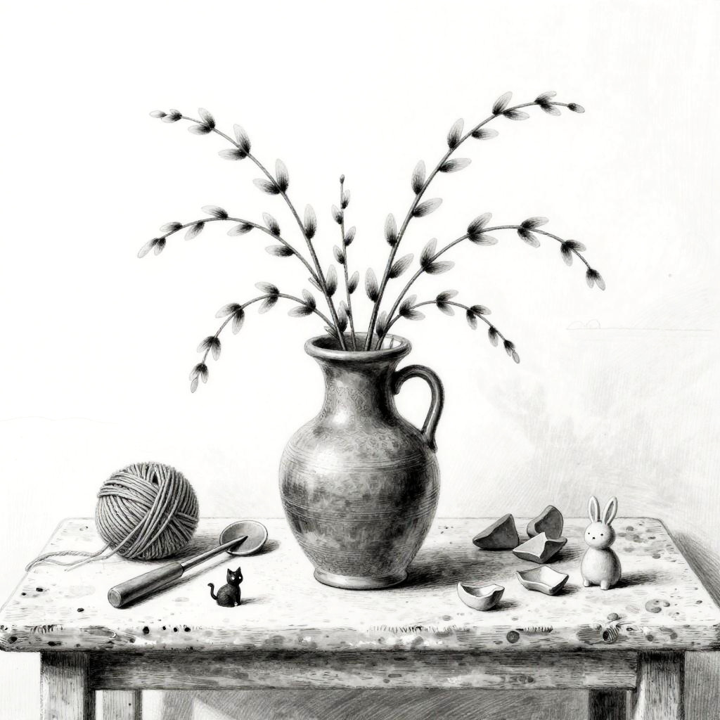 Black-and-white, whimsical hand-drawn still life on a antique pottery studio shelf, centered on clay jug holding curly willow twigs. Arranged around it: potter’s tools, skein of yarn, terracotta shards. Tiny figurines of a cat and a rabbit add charm. Background is minimal, a few lines suggesting a wall and horizon. Soft shading, gentle crosshatching, delicate line art, balanced negative space, subtle paper grain, calm studio light, sketchbook aesthetic.