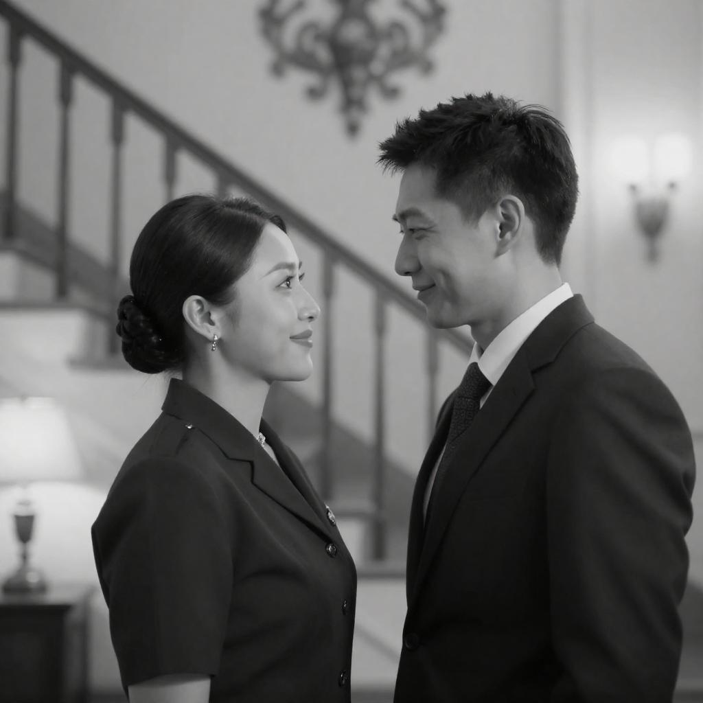 Photograph of a couple dancing closely, foreheads touching. Man in dark suit, white shirt, woman in black dress. Both smiling. Man's hair slicked back, woman's hair in a ponytail. Blurred background with greenery and wall. Hand holding visible. Warm light.