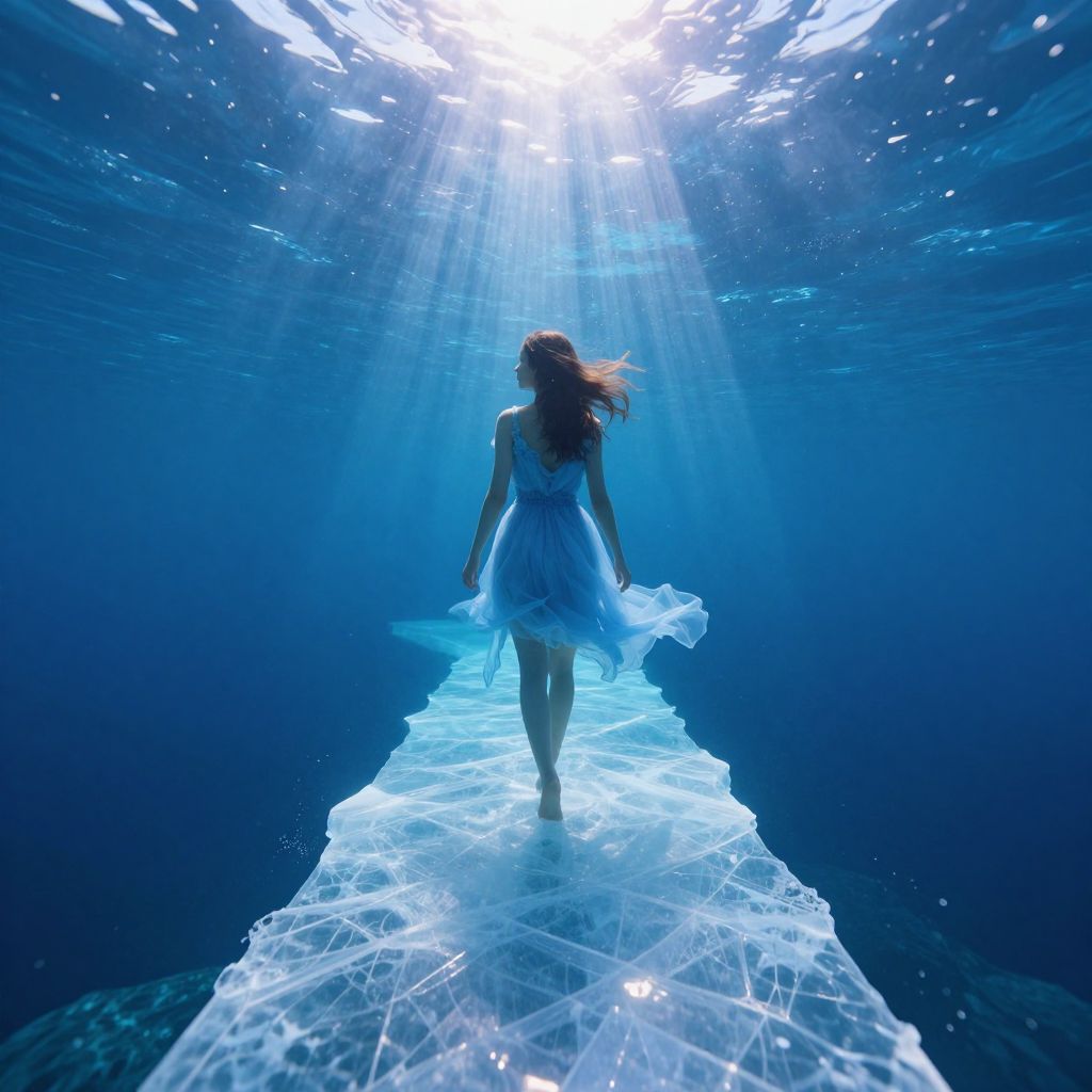 A surreal underwater scene rendered in high-definition digital art, featuring a woman in a flowing blue dress walking along a translucent ice path, illuminated by ethereal sun rays piercing through the deep blue water, evoking a dreamlike, otherworldly atmosphere reminiscent of cyberpunk aesthetics.