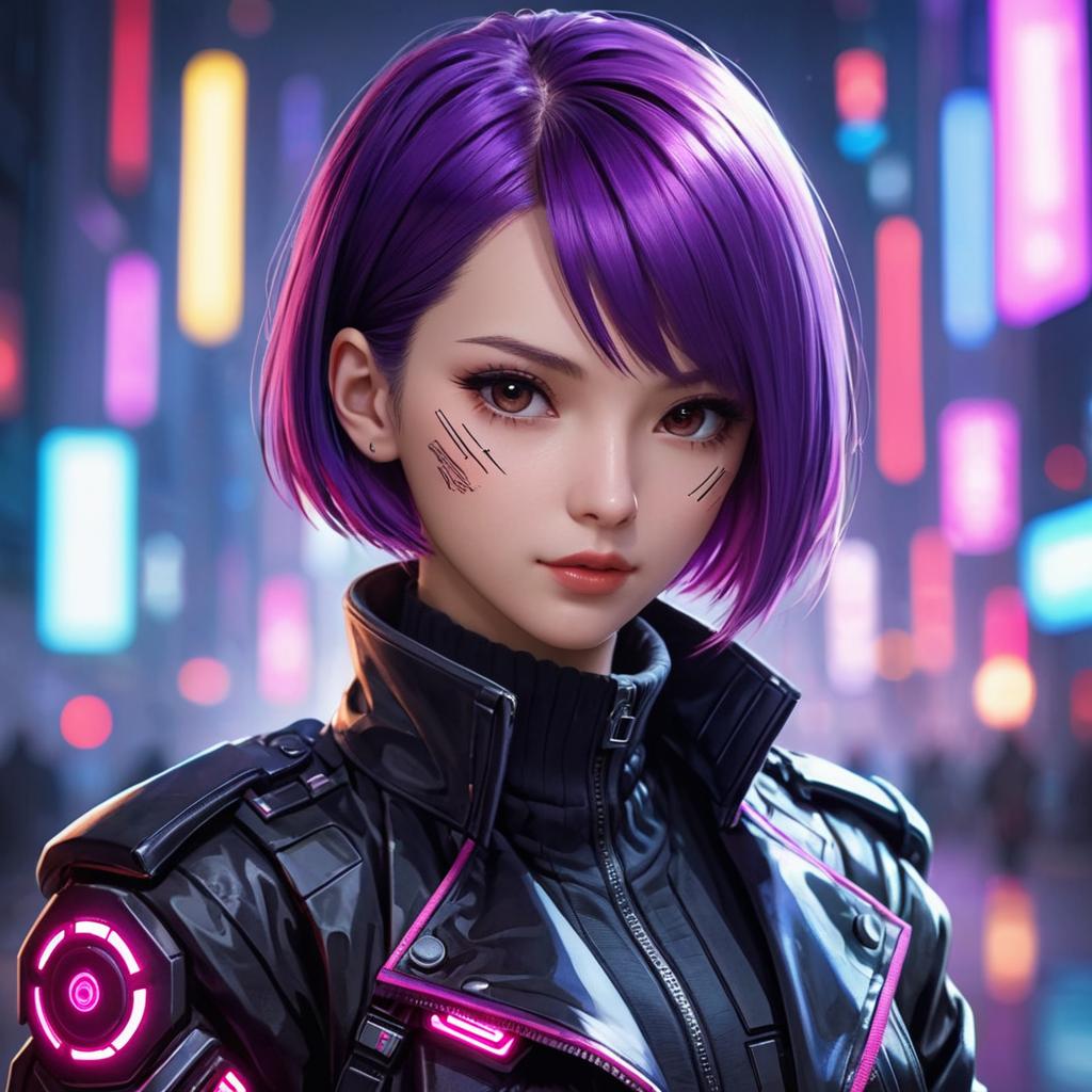 Portrait of a cyberpunk young woman with short purple hair and red eyes, wearing a black futuristic jacket with pink neon accents and a turtleneck. She has cybernetic facial markings and a confident expression, set against a blurred neon-lit urban background.
