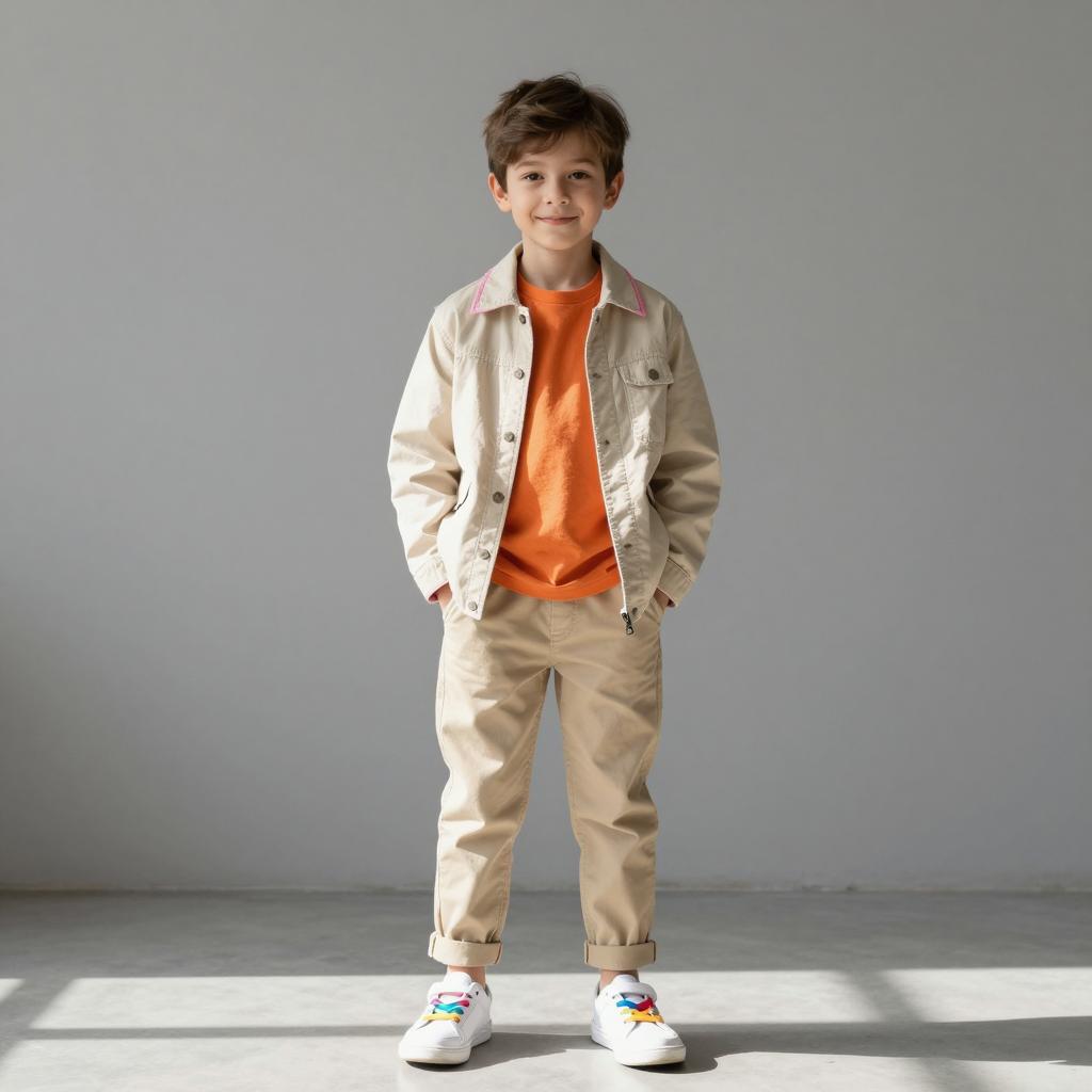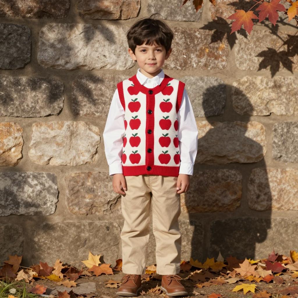 Young boy standing in front of a stone wall during autumn, wearing a red and white vest with apple patterns over a white long-sleeve shirt, beige pants, and brown shoes. The scene includes fallen autumn leaves on the ground and sunlight casting shadows, with a tree branch and red leaves visible in the top right corner.