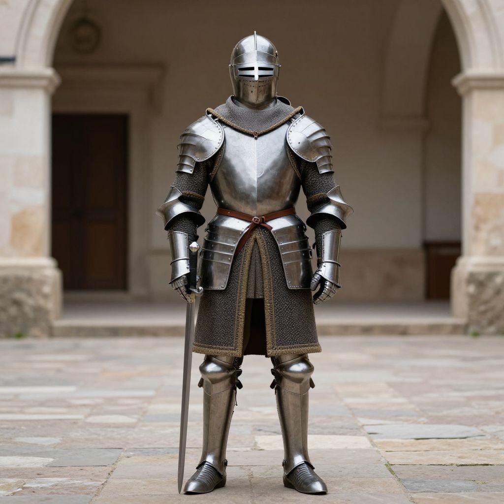 Medieval guard costume, knight in armor standing in a courtyard with a sword