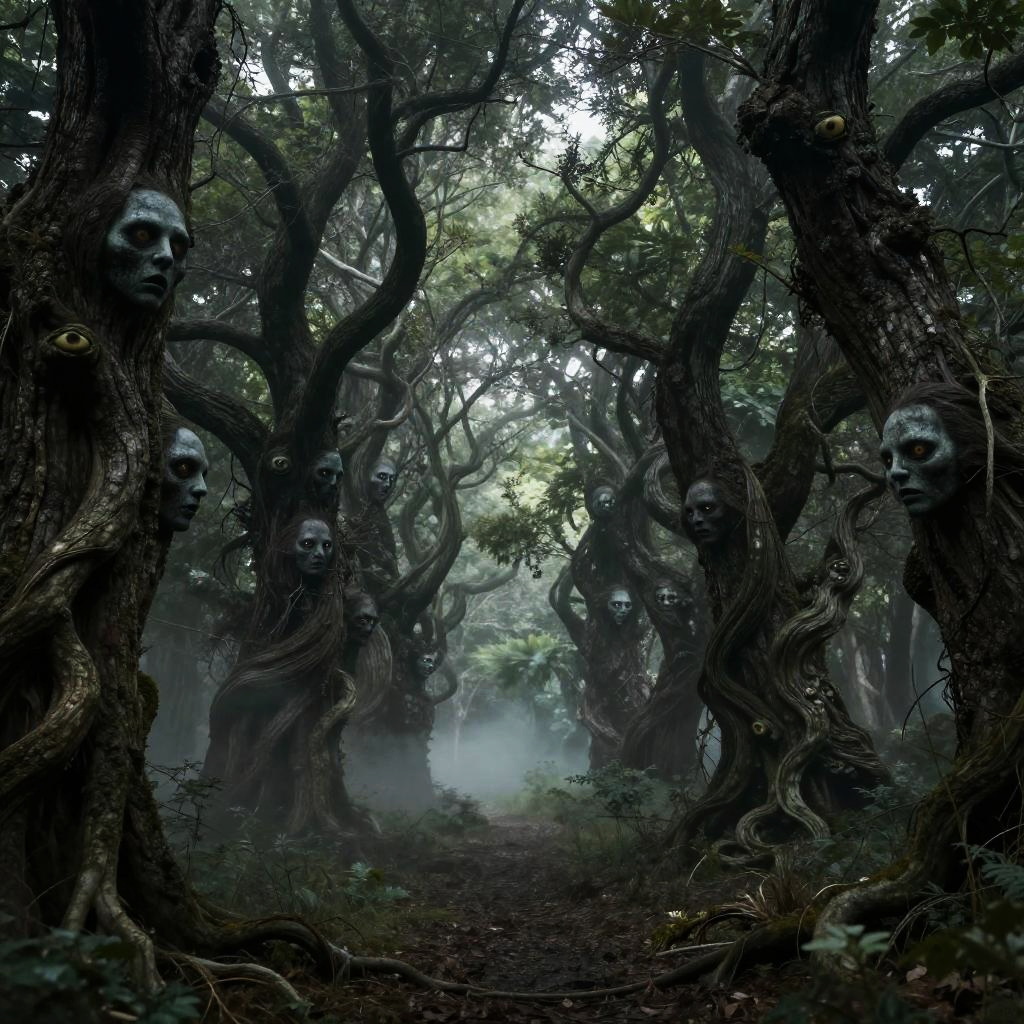 Creepy uncanny images featuring a dense forest with impossibly twisted trees, strange faces emerging from the bark, glowing eyes hidden among the branches, mist curling on the forest floor, an oppressive, surreal atmosphere with muted greens and grays.