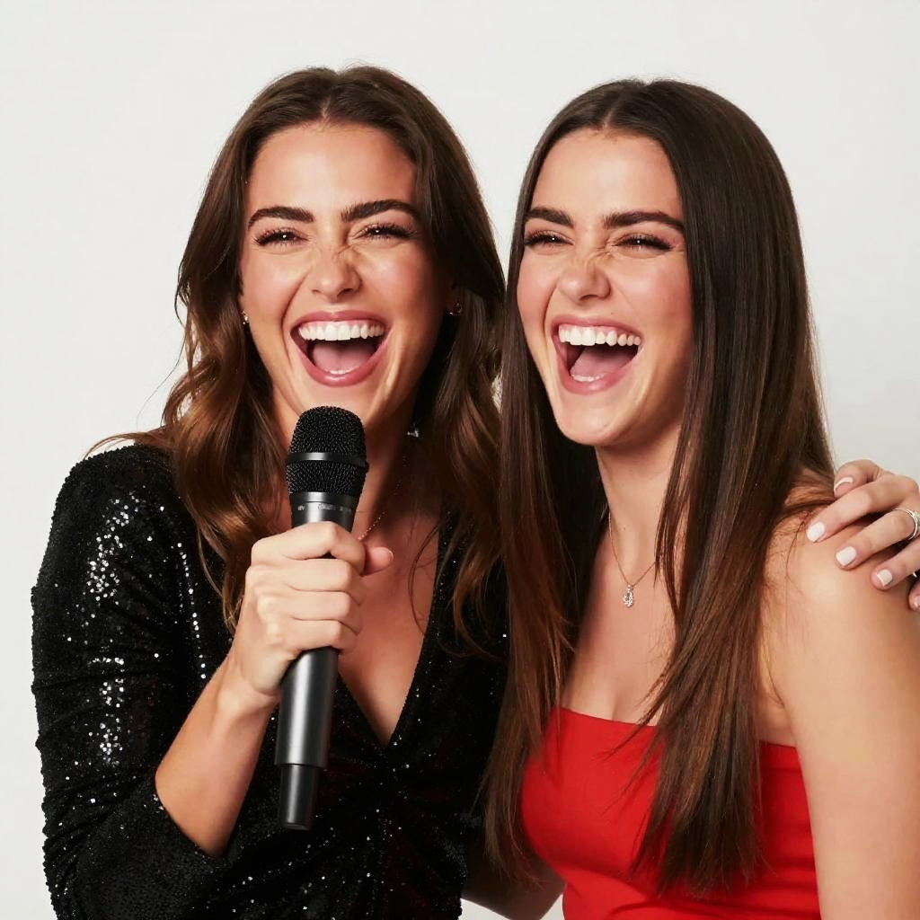 Photograph of two smiling young women with fair skin and light makeup, positioned against a white background. The woman on the left has long, wavy brown hair, wearing a black sequined sleeveless top, and holds a black microphone close to her mouth. The woman on the right has straight dark brown hair, adorned with a blue headband, and wears a black top. She points at her mouth with her right hand, showing red-painted nails. Both women have bright white teeth and are looking directly at the camera, exuding a lively and energetic vibe.