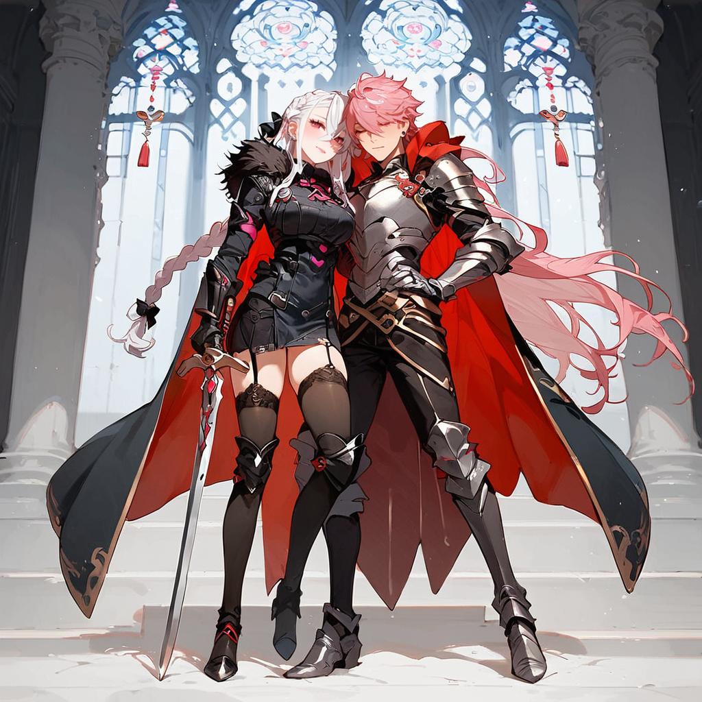 Score_9, score_8_up, score_7_up, score_6_up, source_anime, 1boy, otoko no ko, pink hair, pink eyes, ribbon, hair ribbon, braid, hair between eyes, hair intakes, white hair, hair bow, single braid, long hair, long braid, streaked hair, skin fang, bow, black bow, :3, sword, fur trim, garter straps, thighhighs, holding weapon, blush, holding, holding sword, armor, black thighhighs, long sleeves, cape, weapon, male focus, hand on hip, gauntlets, indoors, castle, full body
