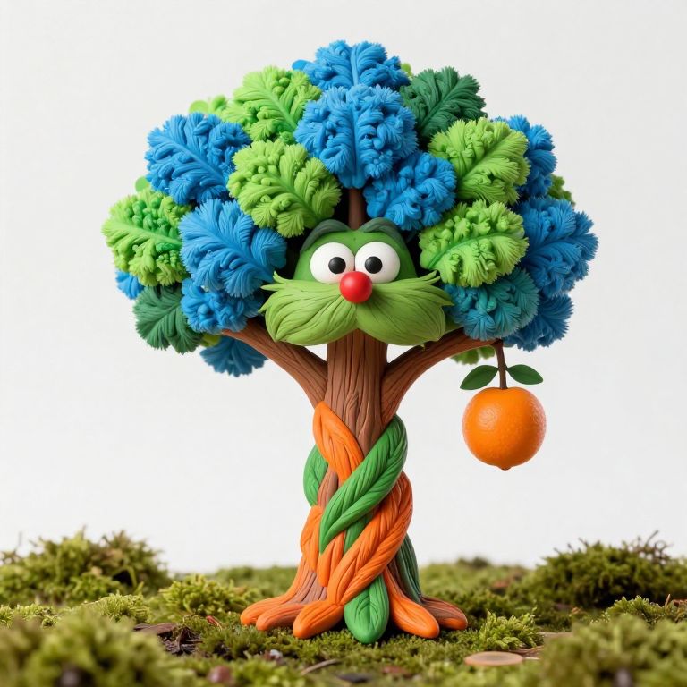The image presents a whimsical, photorealistic scene reminiscent of the Dr. Seuss universe. At the center, a tree with a face, resembling the Lorax, stands tall with a vibrant, braided trunk in shades of orange and green. Its leaves are a striking combination of blue and green, crafted from melted crayola wax, giving them a textured, almost fluffy appearance. The tree's face, with large, expressive eyes and a red nose, adds a sense of personality and charm. To the right of the tree, a small, round orange fruit hangs from a branch, adding to the fantastical nature of the scene. The ground is covered in a layer of green moss, enhancing the natural, earthy feel. The overall composition is balanced, with the tree and its fruit positioned slightly to the left, creating a sense of depth and perspective. The interplay of colors, textures, and shapes creates a visually engaging and imaginative scene.