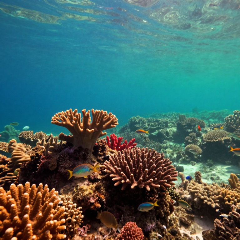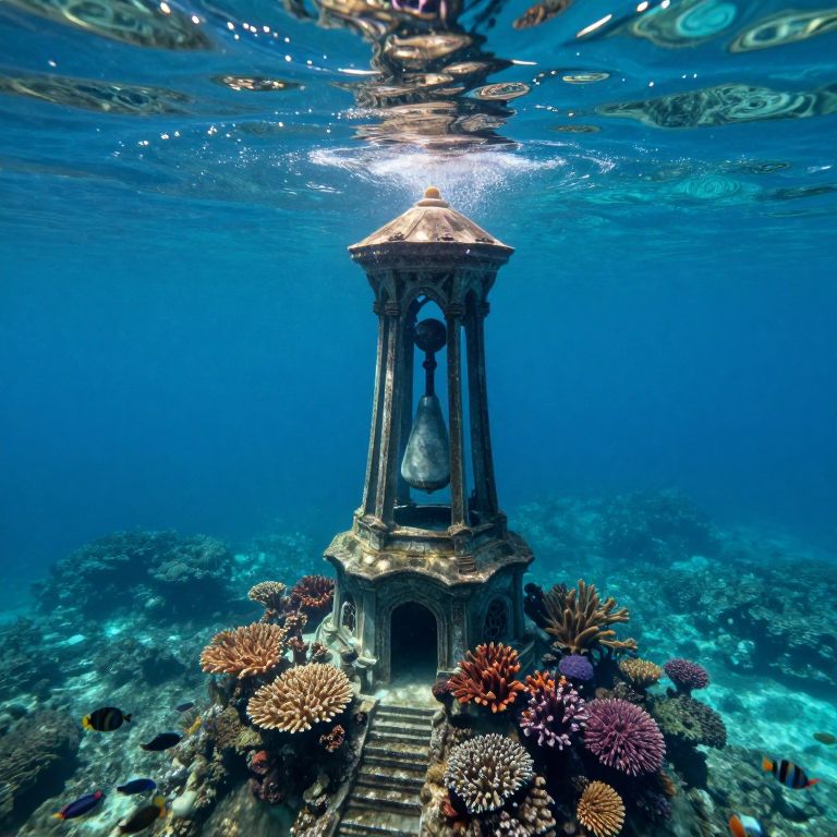 A dreamlike underwater scene emerges, reminiscent of surrealistic paintings, where an antique tower rises from the depths, its pendulum moving in slow motion as it defies gravity amidst vibrant coral and exotic fish. From an aerial viewpoint above the water's surface, sunlight filters through the waves, casting dappled patterns on the serene ocean that contrasts with the twisted architecture below, evoking a sense of both tranquility and mysterious intrigue.