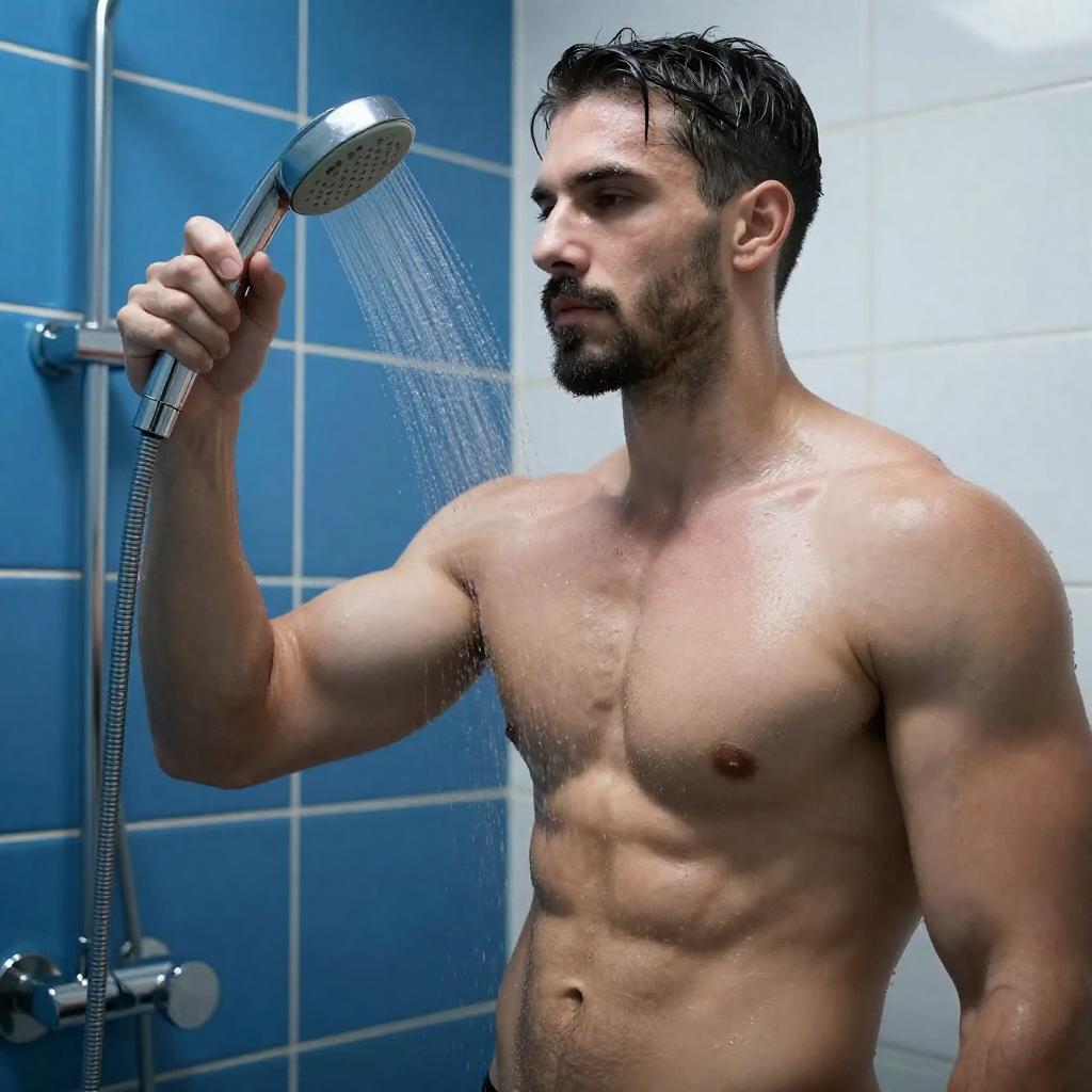 Photograph of a muscular, shirtless man with wet, dark hair and a trimmed beard, standing in a modern shower. He holds a showerhead, water cascading down his defined chest and abs. The shower has blue-tiled walls and bright, cool lighting. His focused expression is directed at the showerhead.