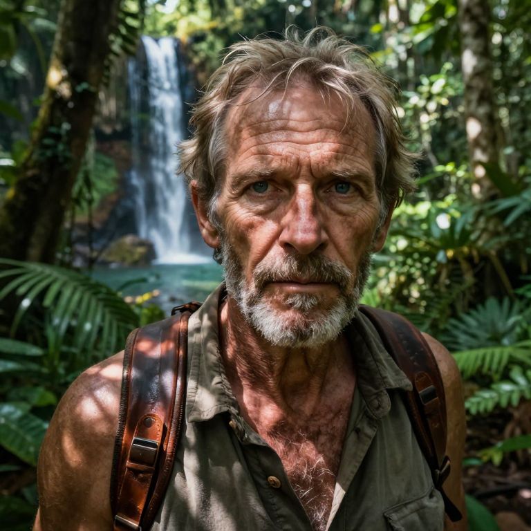 Photograph of a rugged, middle-aged man with graying, unkempt hair and a beard, standing in a dense jungle. He has sun-weathered skin and intense blue eyes. He wears a brown, sleeveless shirt with a dark brown leather backpack over his shoulders. Sunlight filters through the lush green foliage, illuminating his face. In the background, a cascading waterfall is partially visible, adding a sense of depth and tranquility to the scene. The image has a high-contrast, vibrant color palette, emphasizing the natural beauty and the man's weathered appearance.