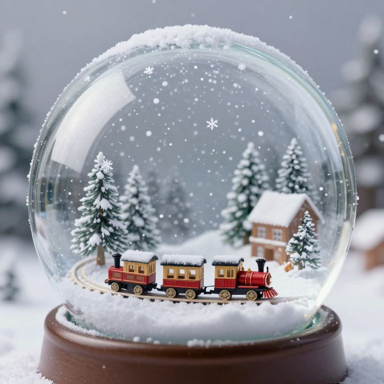 Within the crystalline embrace of a snow globe, a miniature train traverses an eternal winter wonderland, its rhythmic journey weaving a symphony of serenity and nostalgia, where the dance of snowflakes and the hum of lullabies evoke a timeless longing for innocence and the warmth of forgotten dreams.