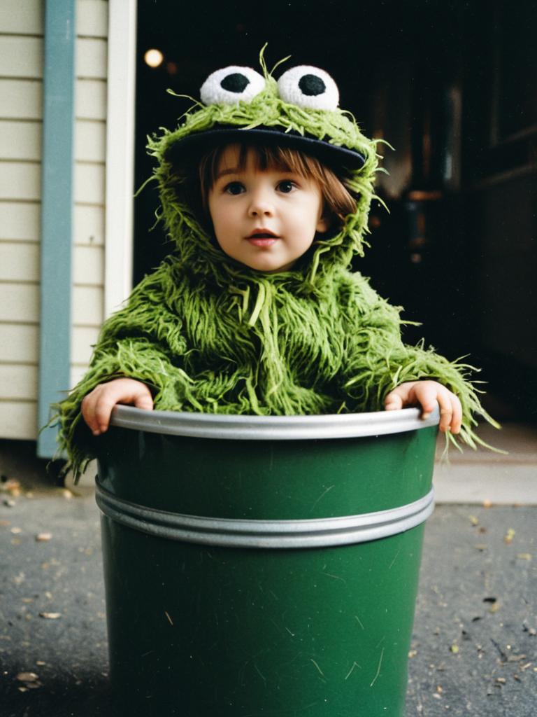 Toddler in Oscar the Grouch Costume, editorial photo with props, cinematic realism