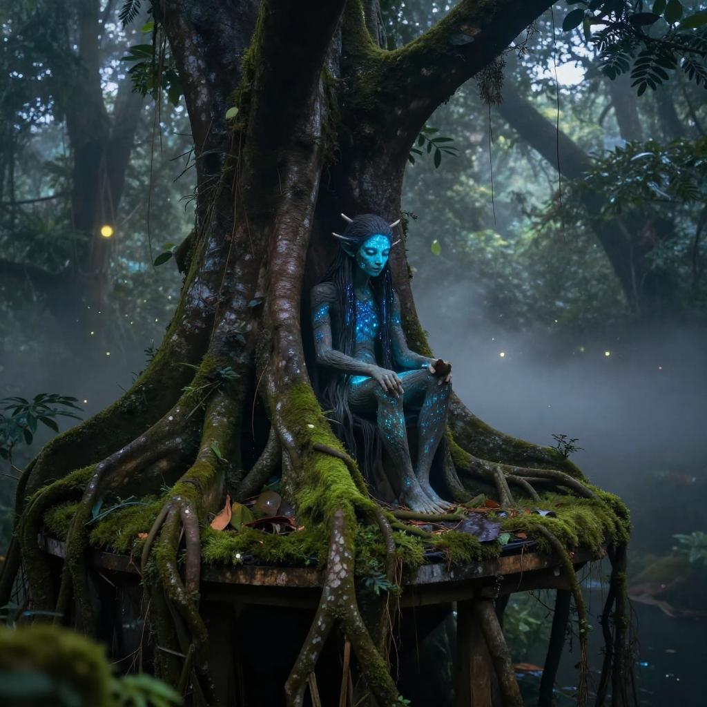 Bioluminescent rainforest spirit perched in moss-covered banyan root platform shrouded in mist and drifting fireflies. Shot on RED V-Raptor 8K, (hyperdetailed), 8K HDR, dramatic lighting, cinematic atmosphere.