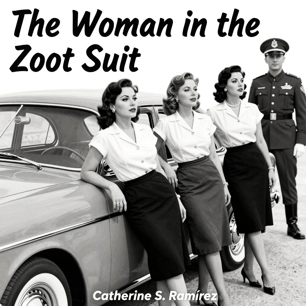 Black and white vintage style book cover illustration titled 'The Woman in the Zoot Suit' by Catherine S. Ramírez. The image features three women in 1940s fashion wearing white blouses and dark pencil skirts, leaning against a classic car with whitewall tires. A male military officer in uniform stands in the background, adding a historical and noir atmosphere.