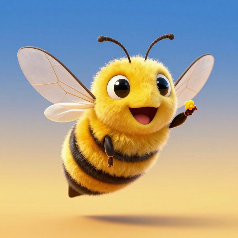 The image depicts an extremely happy bee, its face beaming with joy as it carries a small amount of pollen on its back. The bee's body is a vibrant mix of yellow and black, with a fluffy texture that gives it a soft, cuddly appearance. Its wings are transparent with delicate veins, and it has two long antennae protruding from its head. The bee's eyes are large and expressive, with a glossy black surface that reflects light, adding to its cheerful demeanor. The background is a gradient of warm colors, transitioning from a deep blue at the top to a golden yellow at the bottom, creating a sense of depth and warmth. The bee is positioned centrally in the image, with its wings slightly spread, as if it's in mid-flight, adding a dynamic element to the composition. The overall scene is lively and充满活力, capturing the essence of a joyful and active bee.