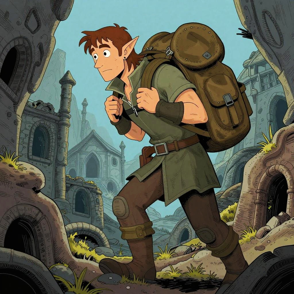 (artwork:1.2), ( lineart:1.33), (lineart:1.33), mature, 1man, portrait male elf rogue adventurer walking upstream in the sewers holding his backpack, close-up, effort, heavy-backpack, (hyperdefined), (inked-art), epic, bright blue brown yellow tones, unusual-angle, ruins setting, cartoon, medieval gothic aesthetic, complex lighting, (flat saturated bright colors), (ultradetailed:1.2), absurdres, (atmosphere), cinematic composition, fine details, perspective, (close-up:1.2), abstract background, (movement:1.2), intense, (sharp focus)