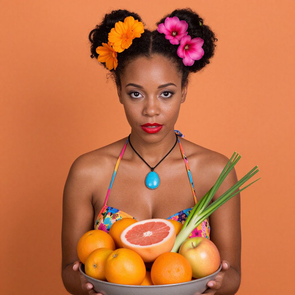 Photograph of an attractive Black woman with medium brown skin and curly hair styled in two buns, adorned with bright orange and pink flowers. She wears a colorful floral bikini top and a blue pendant necklace. She holds a bowl filled with various fruits including oranges, a grapefruit, apple, and green onions, against a vibrant orange background. Her red lipstick contrasts with the colorful backdrop.