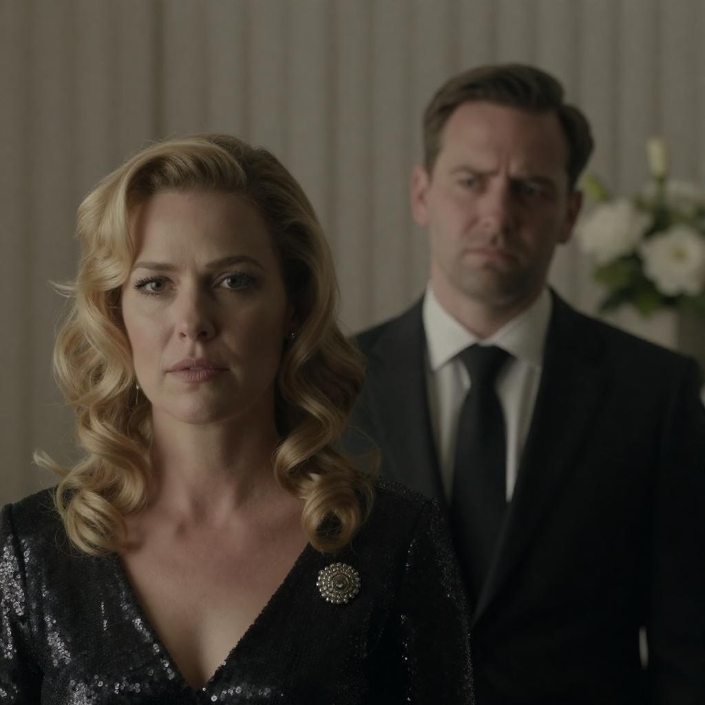 Photograph of a serious-looking man and woman standing close together. Man with dark hair, light skin, gray suit, white shirt, and black tie. Woman with blonde hair, light skin, blue eyes, green cardigan, and pearl earrings. Dark wooden background. Both looking forward with neutral expressions.