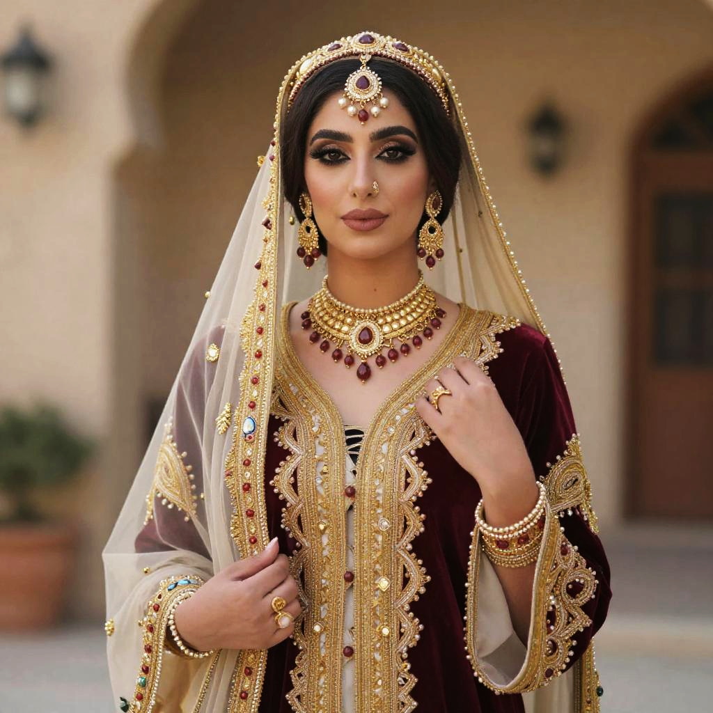 Traditional Tunisian Wedding Dress, woman in traditional indian dress with a veil and jewelry
