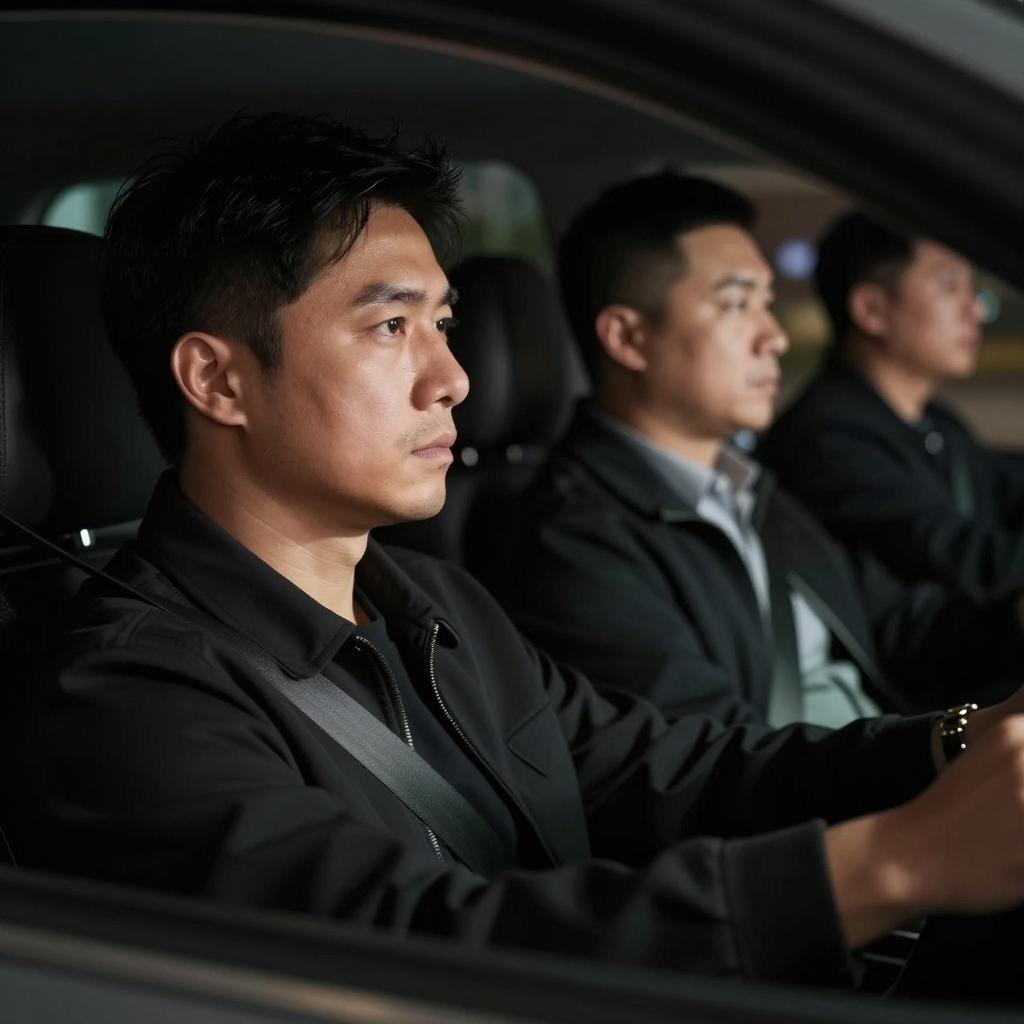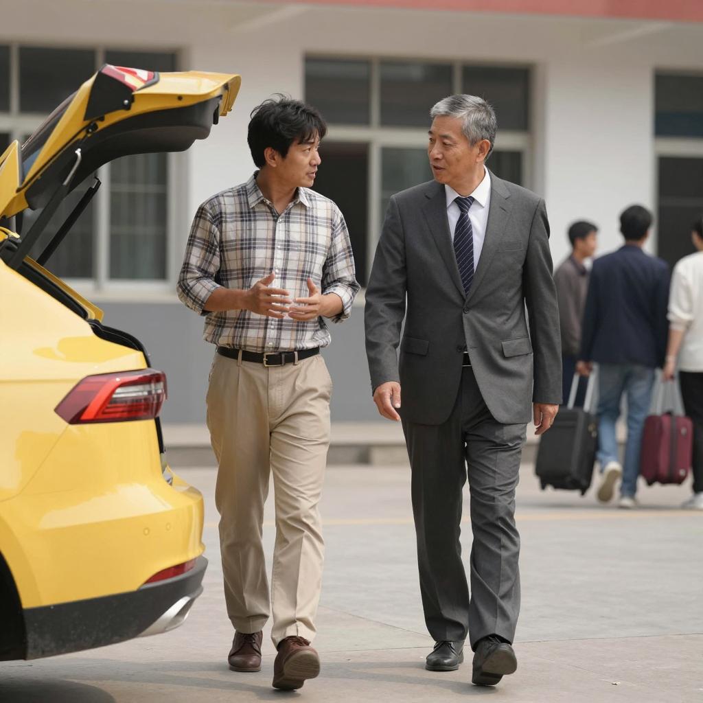 Two men pulling a red cart with wheels in a crowded street. The man in front wears a navy track suit, muscular, focused. The man behind wears a blue shirt with colorful patterns, jeans, and a helmet, seated with a neutral expression. Background: diverse crowd of people, some children, casual clothing. Bright daylight, urban setting.