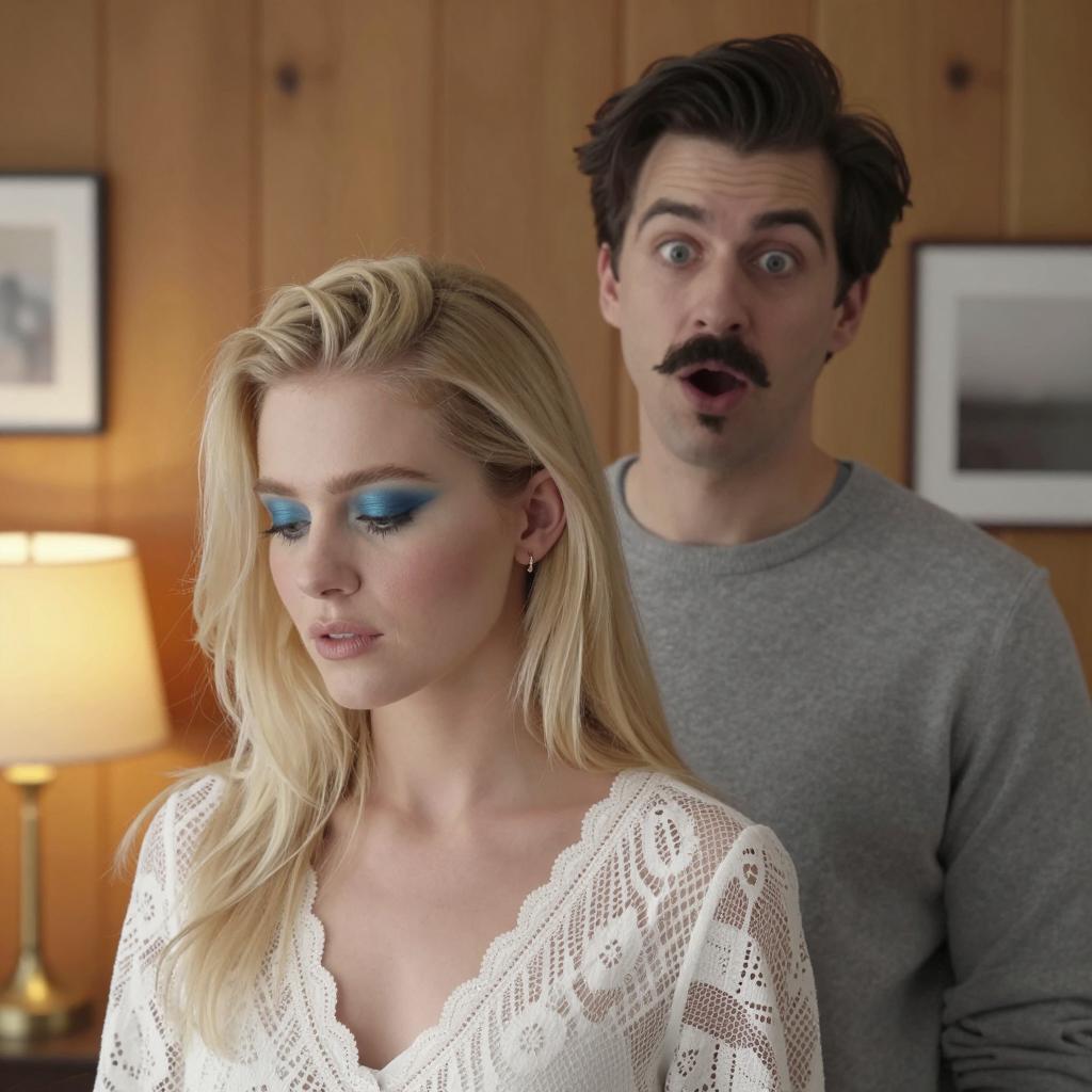 Blonde woman with long hair, blue eyeshadow, white lace top, looking down. Man with black hair, mustache, blue eyes, gray sweater, mouth open, standing behind her. Wooden background, yellow lamp, framed pictures. Two people.