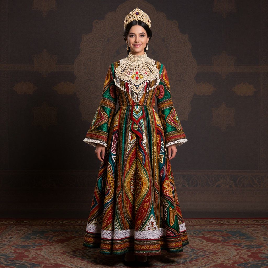 The image depicts a woman standing in a vibrant, full-length folk costume, exuding a sense of traditional elegance and cultural richness. Her attire is a striking ensemble of intricate patterns and bold colors, featuring a high, ornate collar adorned with pearls and elaborate embroidery. The dress itself is a tapestry of hues, with shades of green, red, and gold interwoven to create a visually captivating design. The woman's hair is elegantly styled, crowned with a headdress that complements her outfit, adding to the overall regal appearance. The lighting is bright and focused, highlighting the textures and details of her costume, while the background is a muted, patterned backdrop that keeps the attention on the subject. The composition is balanced, with the woman centrally positioned, creating a sense of symmetry and harmony.
