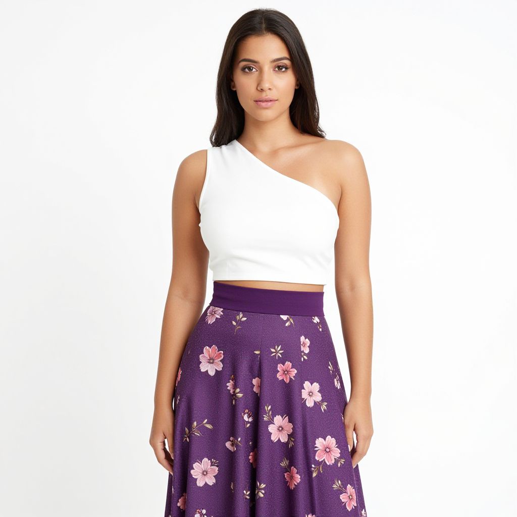 "Woman, contemporary fusion, white asymmetrical crop top, one-shoulder neckline, purple high-waisted skirt with pink floral print, full-length with pleats, solid purple waistband, plain white background.. Sexy. Pretty face and beаutiful eyes. Big breasts."